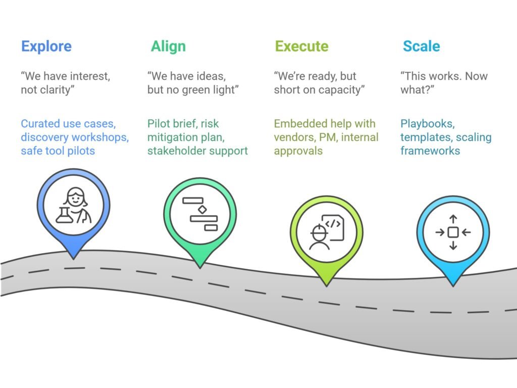 Get a fundable, stakeholder-aligned pilot plan with governance scaffolding, ROI logic, and a clear delivery path.