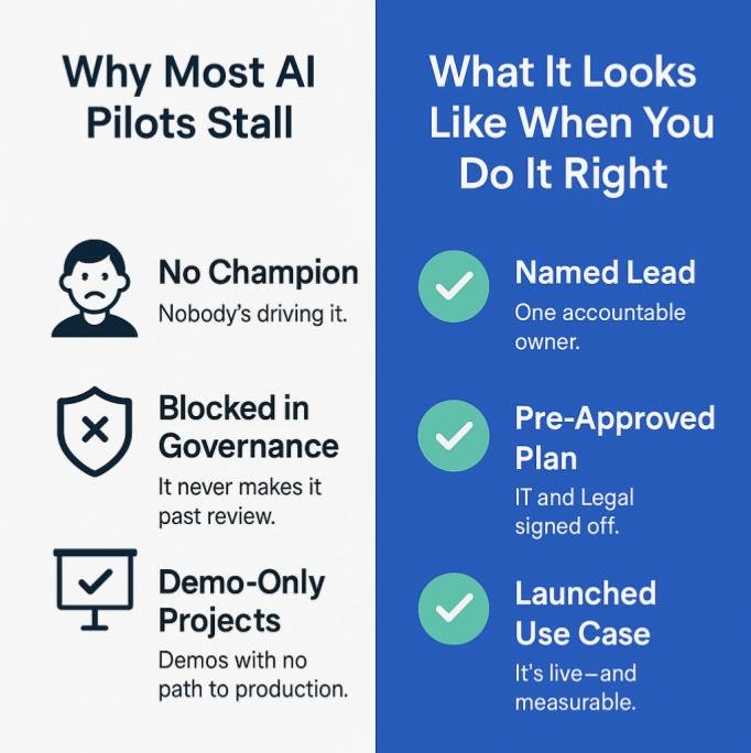Most internal AI initiatives stall before they start. Not because the tech is flawed, but because the business case is unclear, IT is wary, Legal is overloaded, and no one owns the process.